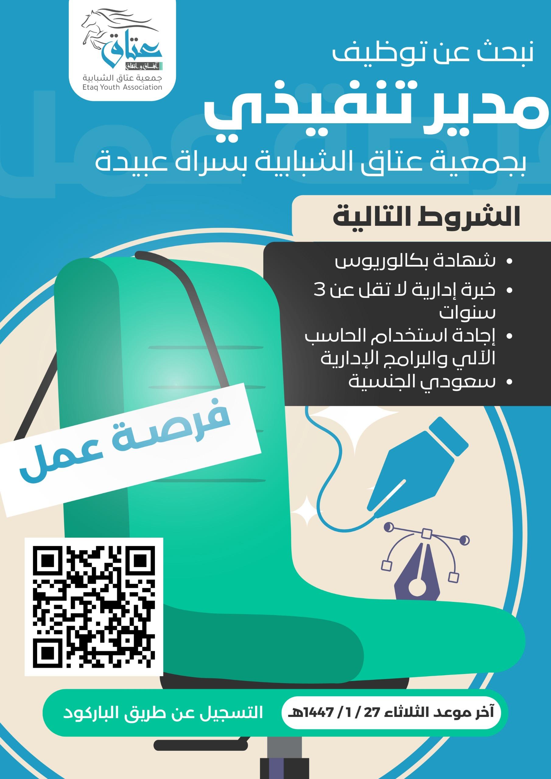 تعلن جمعية عتاق الشبابية عن توفر فرصة وظيفية بمسمى:
